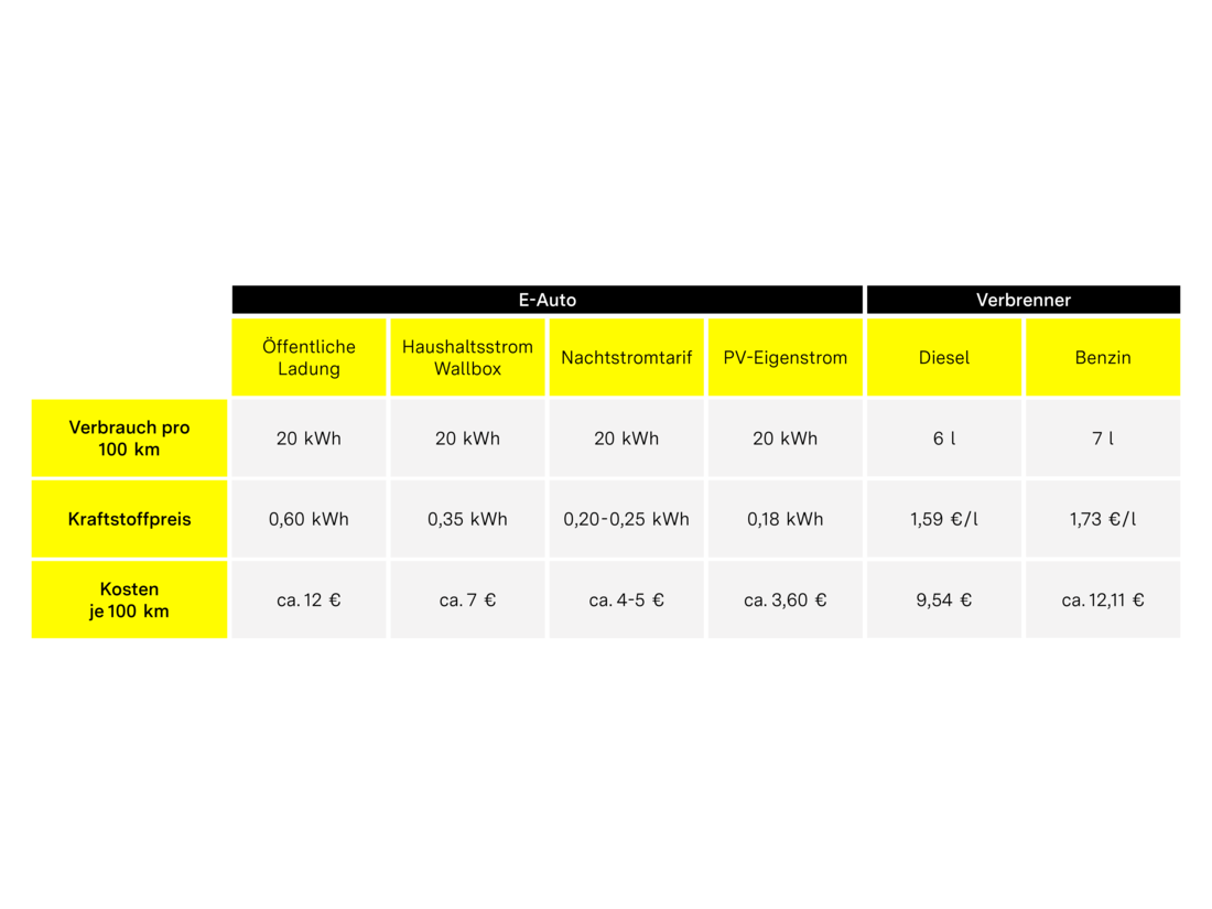 - Formel: (Kilometer/Monat) ÷ 100 × (Kilowattstunden/100 Kilometer) × Strompreis