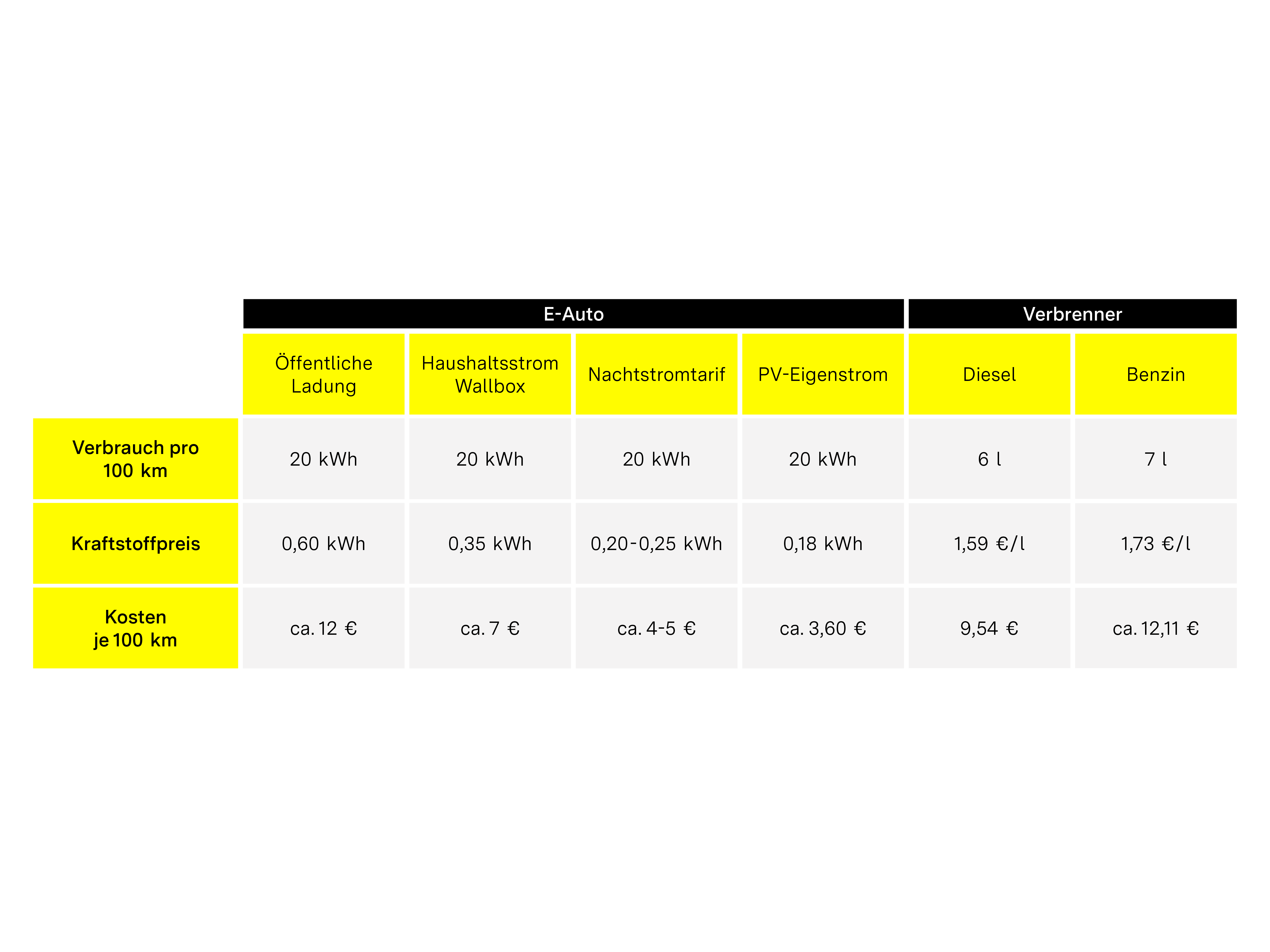 - Zum Vergleich: gleiche Strecke Benziner 7 Liter/100 Kilometer, 1,73 Euro = 121,10 Euro/Monat