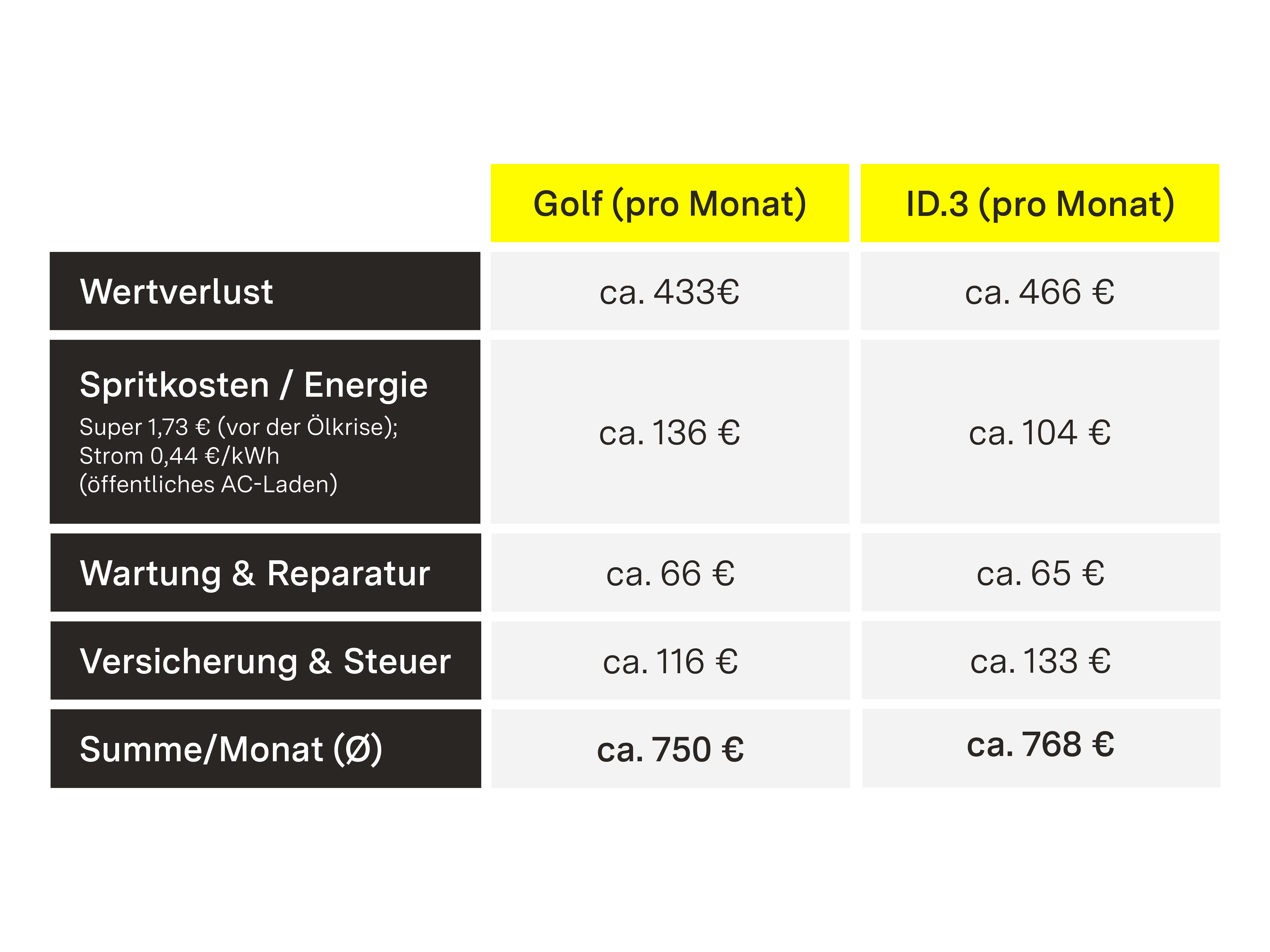 Die ehrliche Antwort: Es kommt darauf an. Der Vergleich zwischen Verbrenner und Elektroauto wird oft auf Spritkosten versus Ladestrom reduziert. Aber es gibt viel mehr zu berücksichtigen. Der ADAC rechnet in seinen Vollkostenvergleichen mit Anschaffungspreis, Wertverlust, Kraftstoff, Wartung und Reparatur sowie Versicherung.